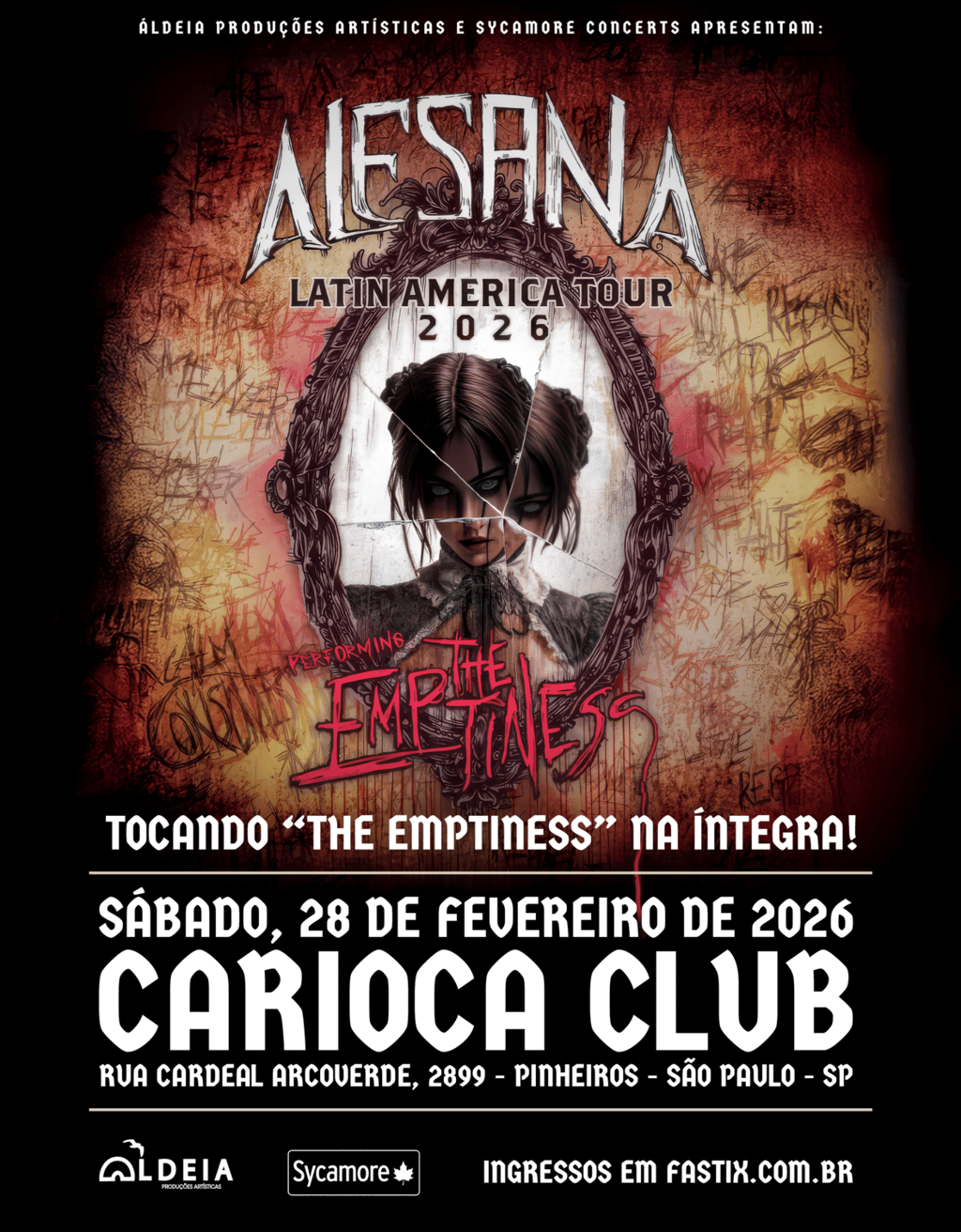Os fãs de post-hardcore e screamo já podem marcar no calendário: o Alesana retorna ao Brasil para uma apresentação única no dia 28 de fevereiro de 2026, no Carioca Club, em São Paulo. O grupo norte-americano traz a turnê comemorativa de 15 anos do álbum The Emptiness, que será executado na íntegra.