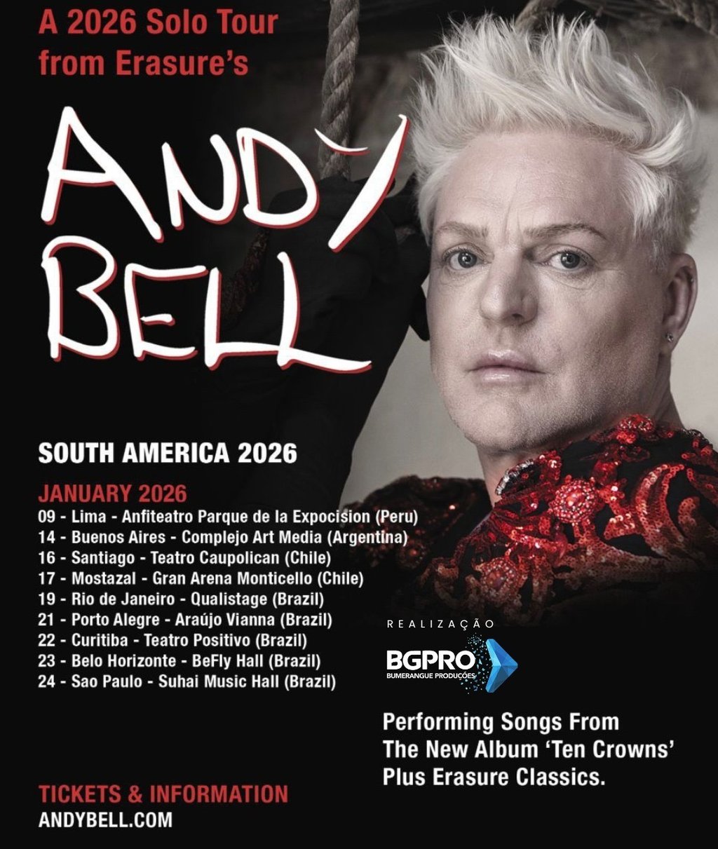 O brilho do synthpop tomará conta do Brasil nesta semana! Andy Bell, o lendário vocalista do Erasure, desembarca no país para uma série de cinco shows inéditos. A turnê não apenas celebra sua carreira de quatro décadas e mais de 20 milhões de discos vendidos, mas também apresenta ao público brasileiro o aclamado álbum solo Ten Crowns (2025).