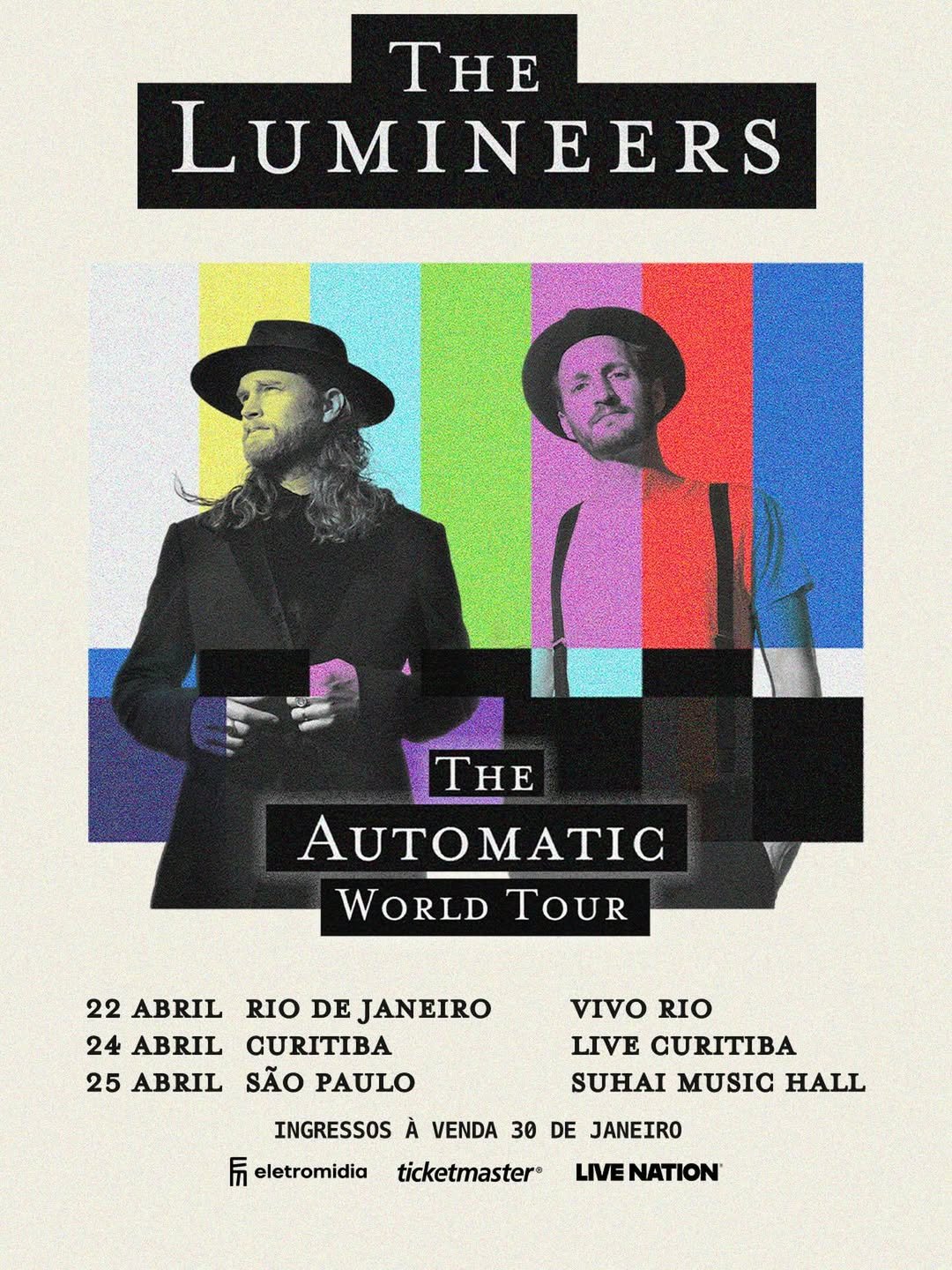 Pré-venda para Fãs: Começa nesta quarta-feira, 28 de janeiro, às 10h (online) e 11h (bilheterias). É necessário cadastro prévio no site oficial thelumineers.com/tour.